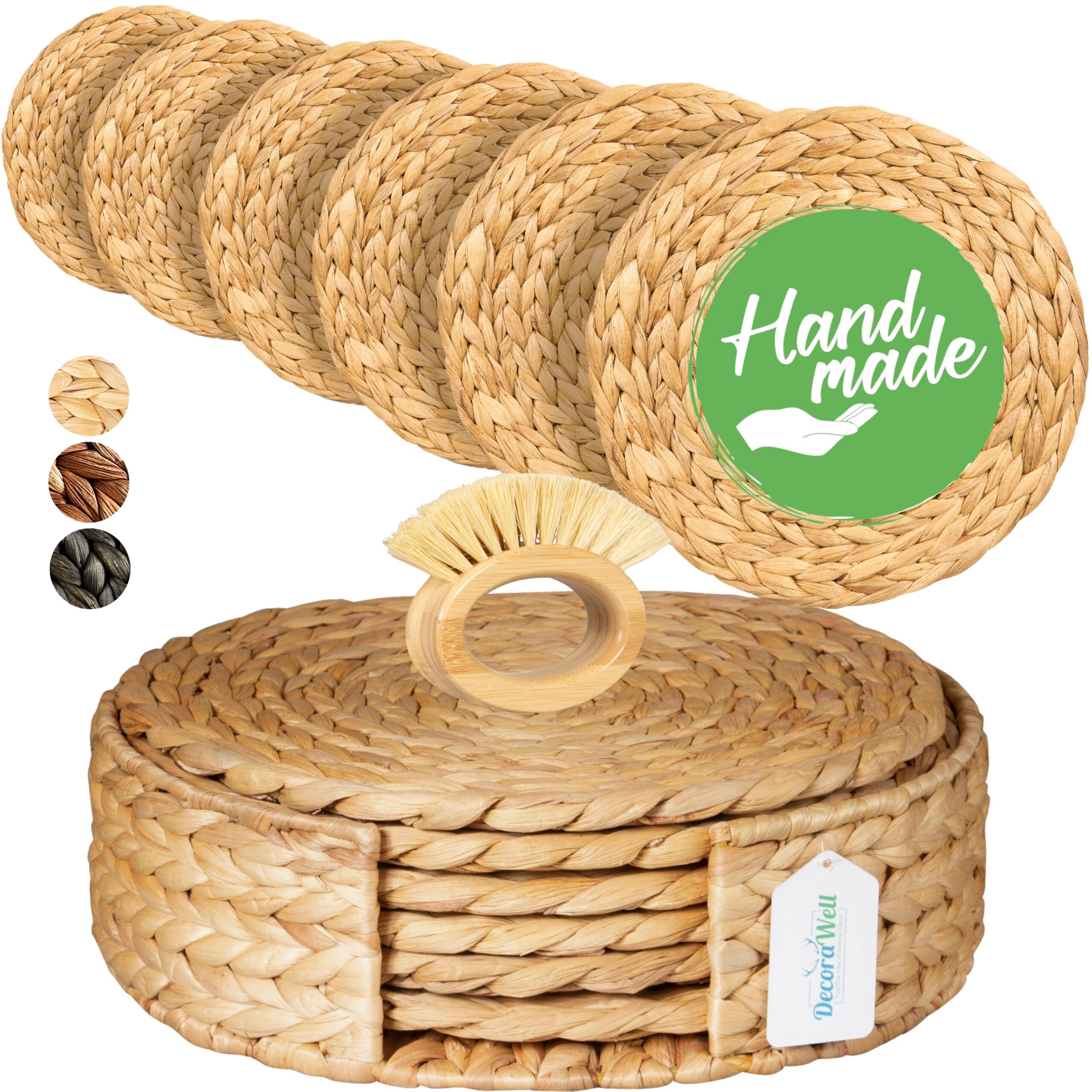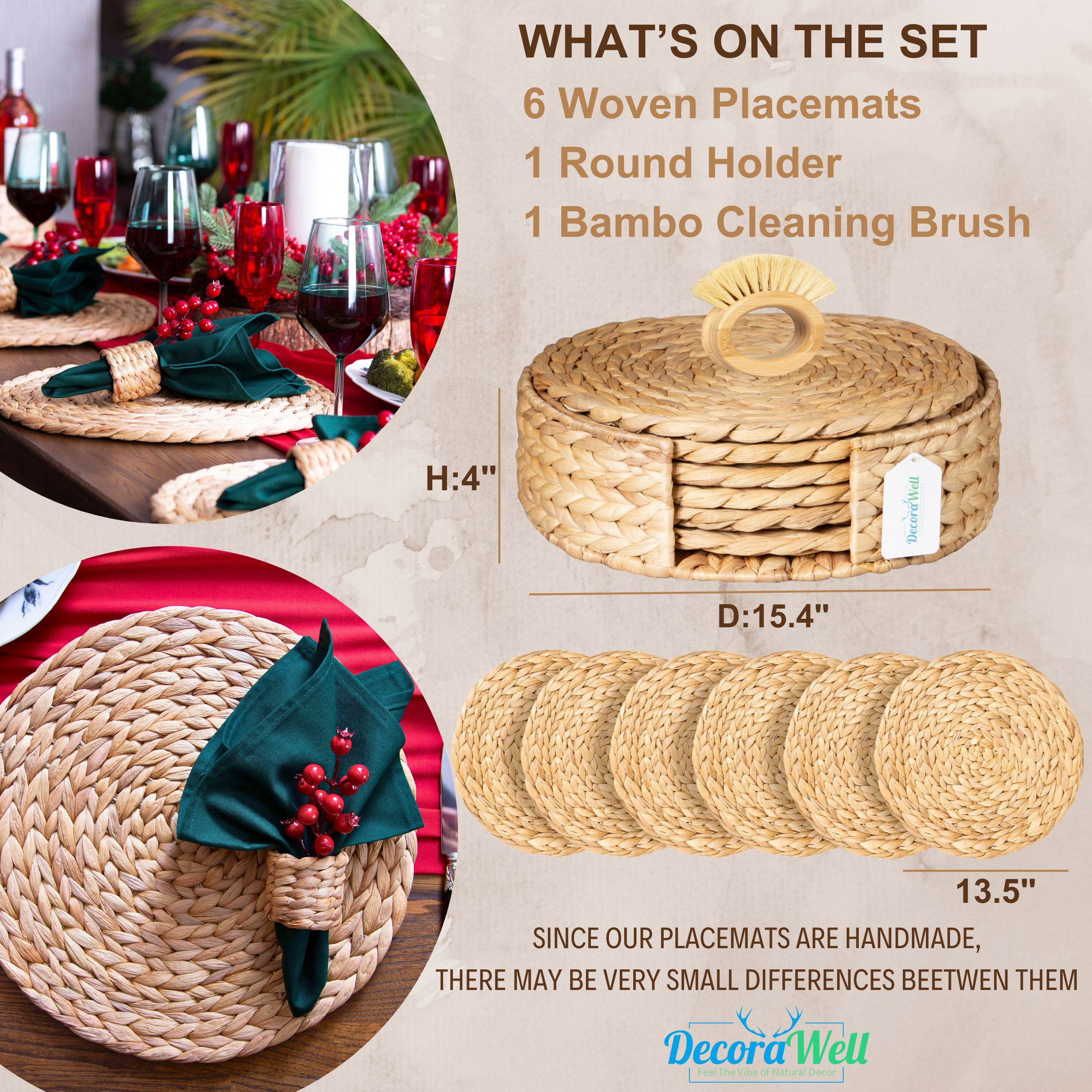 DecoraWell Round Woven Placemats Set of 6 with Bamboo Brush, Handmade, Wicker Placemats with Holder, Rattan Chargers for Dinner Plates, Rustic, Boho Placemats (Tall Brown, 11.8 in)